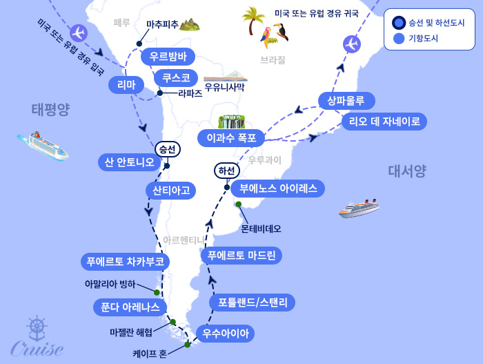 [도시 안내] - 잉카문명의 보고 쿠스코와 세계 7대 불가사의로 불리우는 마추픽추관광- 세계 3대 폭포중에 하나인 이과수 폭포관광- 코르코바도 언덕의 예수상으로 유명한 리오 데 자네이로관광- 페루의 수도이자 남미 이동의 중심인 리마관광- 칠레의 수도이며 크루즈를 탑승하는 발파라이소, 산티아고관광- 하늘 아래 또 다른 하늘이 펼쳐지는 우유니 소금사막 관광- 하늘과 가장 가까운 도시 라파즈 관광